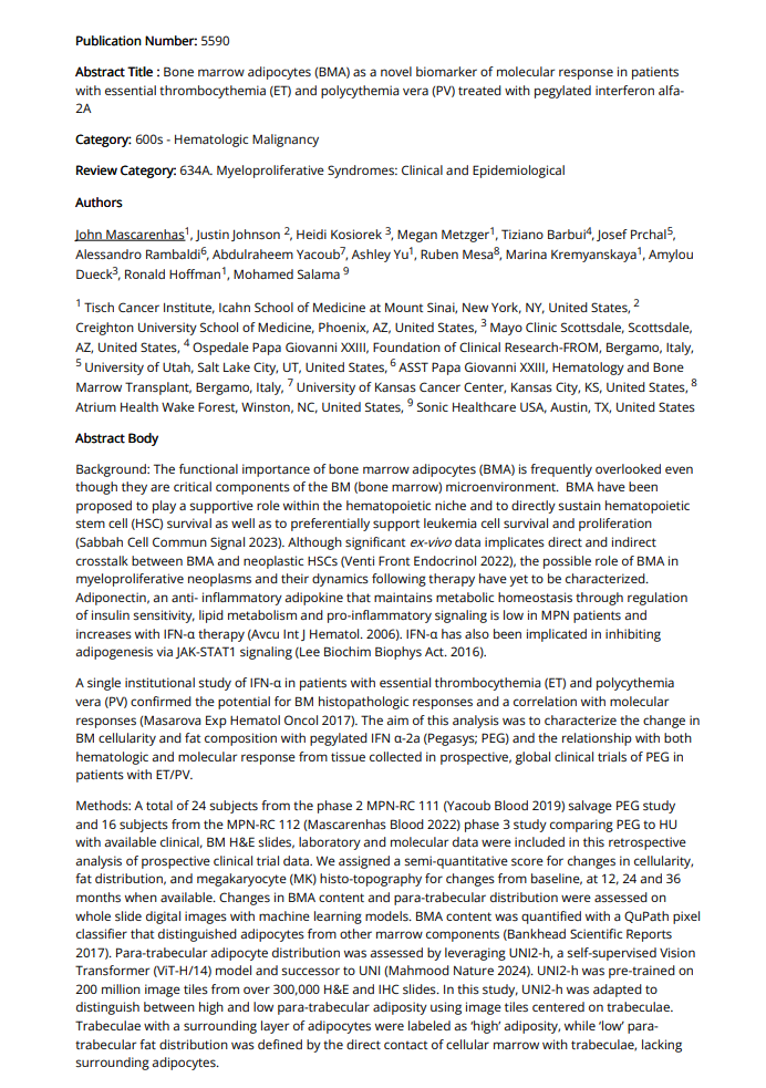 Bone marrow adipocytes (BMA) as a novel biomarker of molecular response in patients with essential thrombocythemia (ET) and polycythemia vera (PV) treated with pegylated interferon alfa-2A