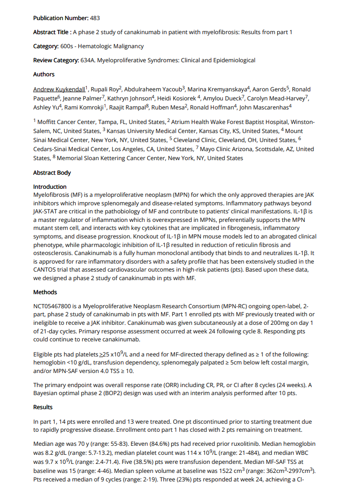 A phase 2 study of canakinumab in patient with myelofibrosis: Results from part 1