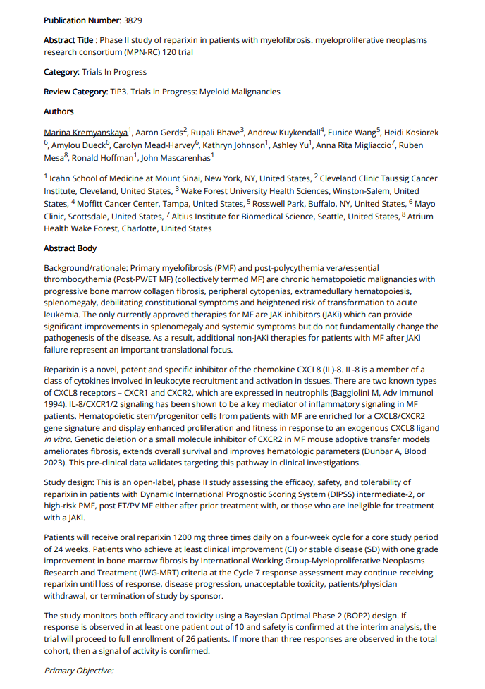 Phase II study of reparixin in patients with myelofibrosis. myeloproliferative neoplasms research consortium (MPN-RC) 120 trial
